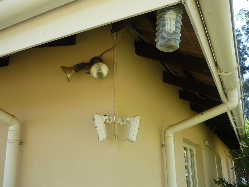 Two motion sensor on one corner of the house. There are a total of 7 such sensors that cover the perimeter of the house and are switched on shortly after sunset, then switched off just before sunup.